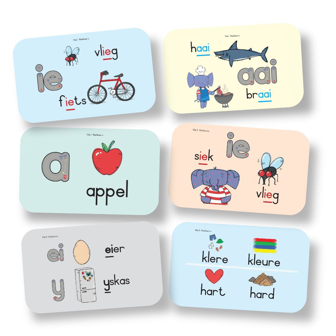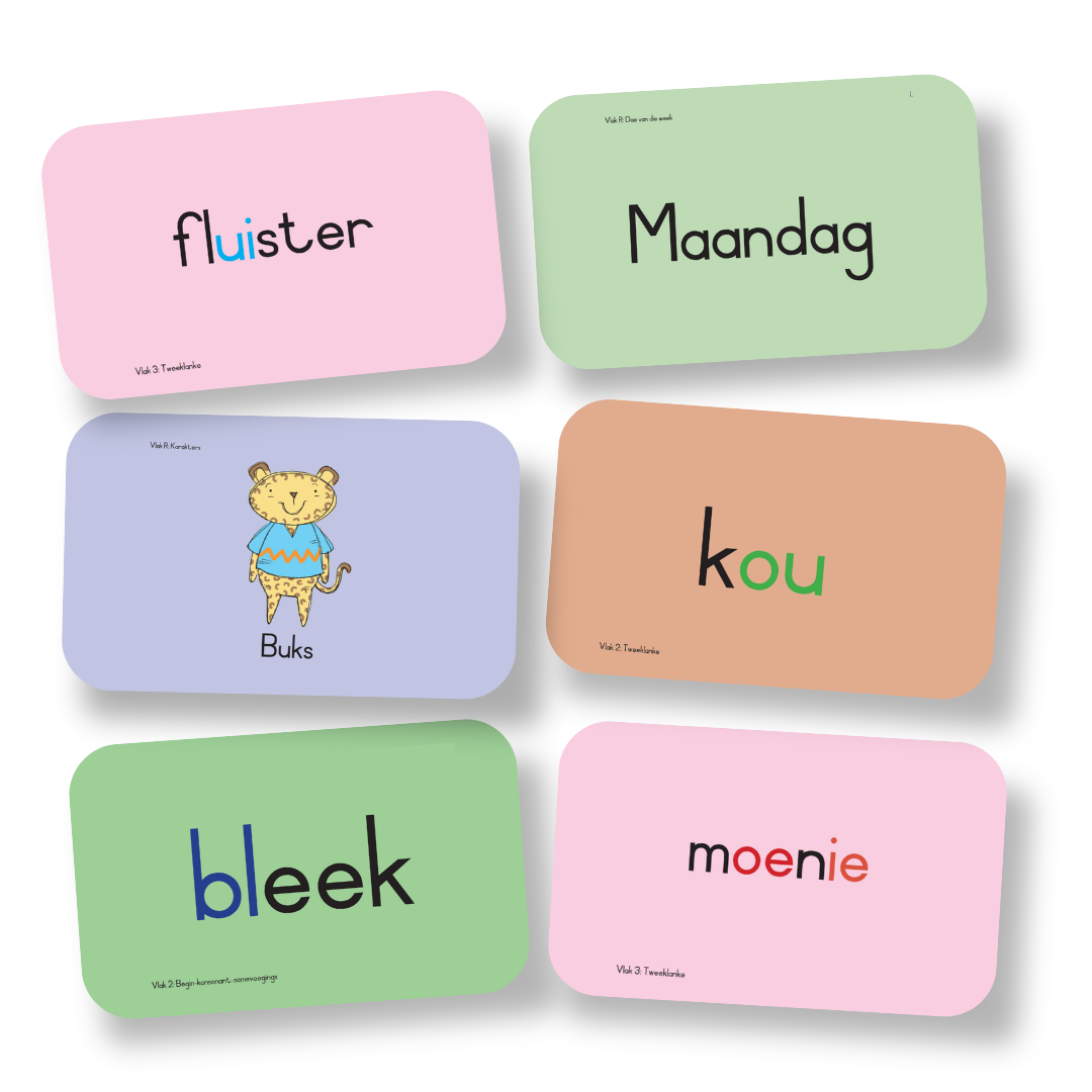 Die flitskaarte is ’n ekstra hulpmiddel wat die onderwyser kan gebruik vir onder andere klank-, lees- en woordherkenningsaktiwiteite. Die flitskaarte het ’n verskeidenheid konsepte wat volgens ’n kleurkode uiteengesit is.